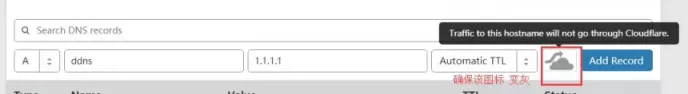 在 Cloudflare 中新建一个 A 记录,如:ddns.yourdomain.com,指向 1.1.1.1